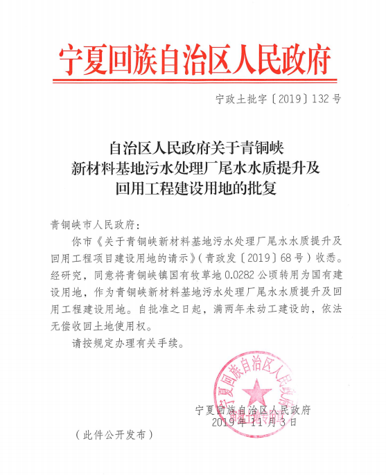 | 标 题: | 自治区人民政府关于青铜峡新材料基地污水处理厂尾水水质提升及回用工程建设用地的批复 | ||